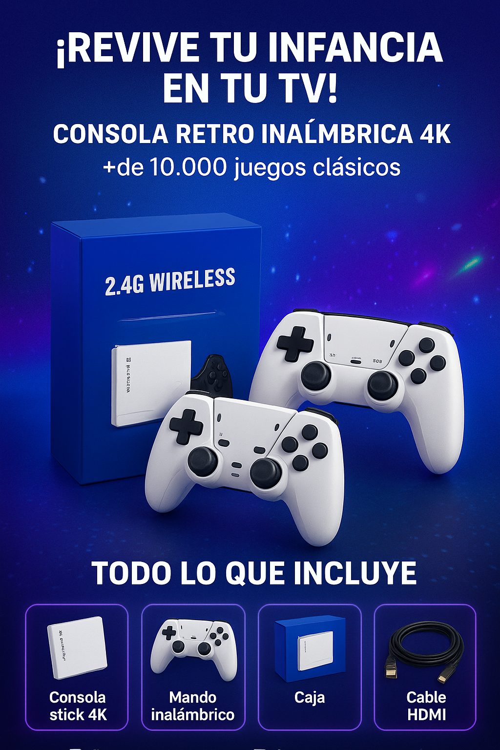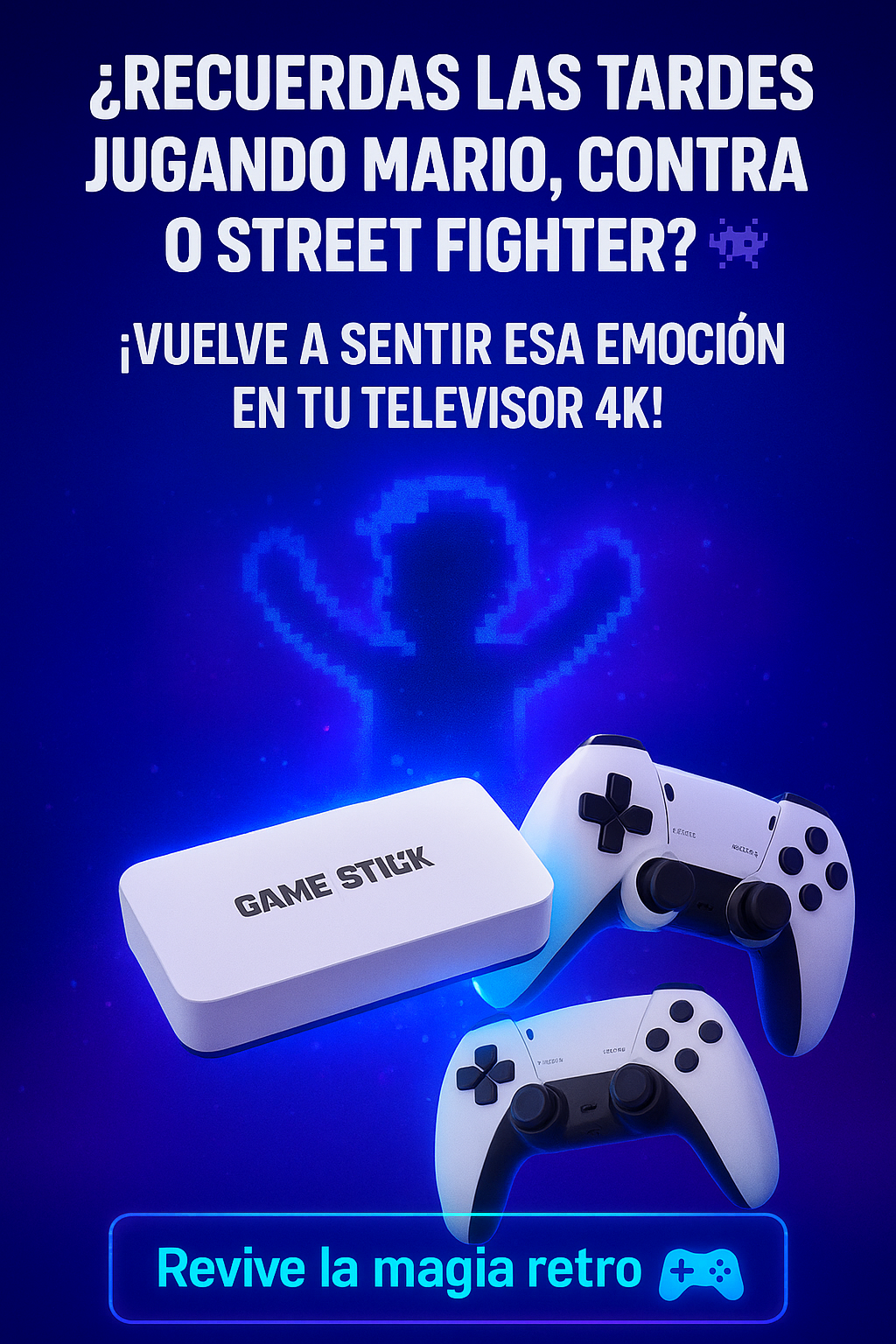 Conecta el Game Stick 4K al puerto HDMI de tu TV, enciéndelo y disfruta de miles de juegos sin descargas ni internet.